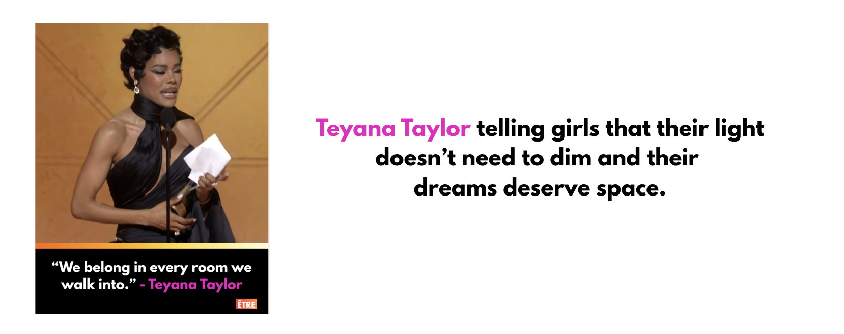 “To my brown sisters and little brown girls watching tonight, our softness is not a liability. Our depth is not too much. Our light does not need permission to shine. We belong in every room we walk into. Our voices matter and our dreams deserve space.”